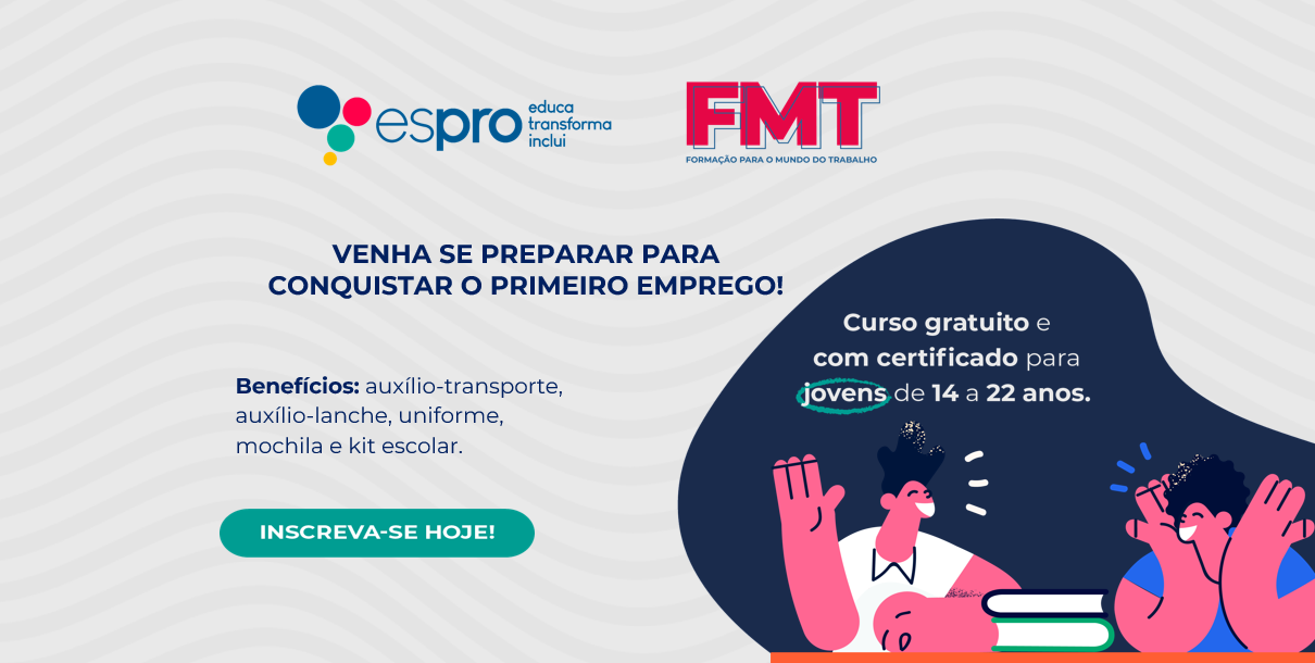 A Formação para o Mundo do Trabalho (FMT) do Espro é uma jornada de capacitação profissional gratuita, focada em empregabilidade e habilidades interpessoais para adolescentes e jovens, em situação de vulnerabilidade social, que estão em busca do primeiro emprego.