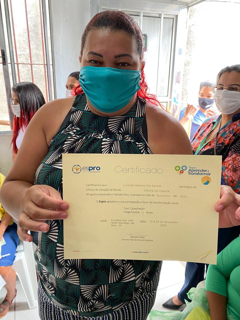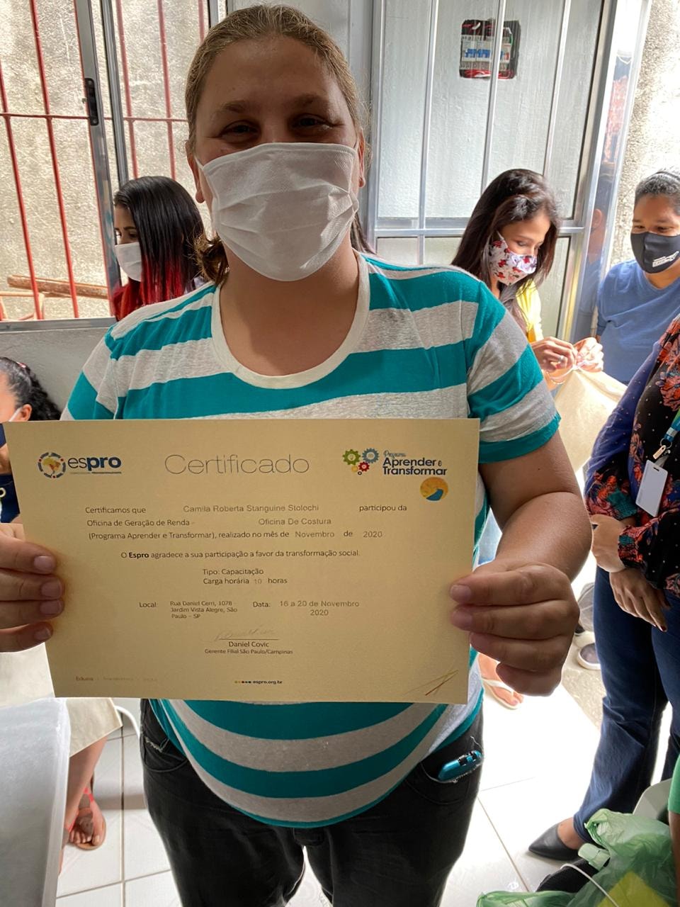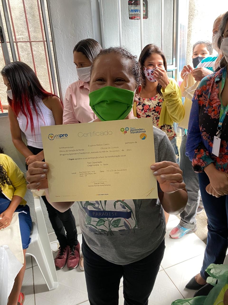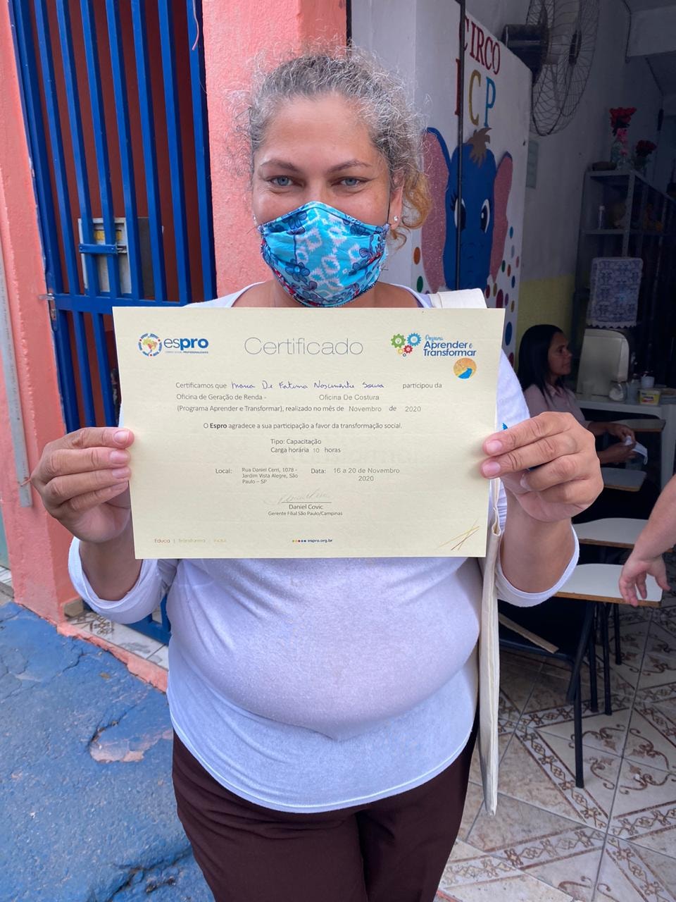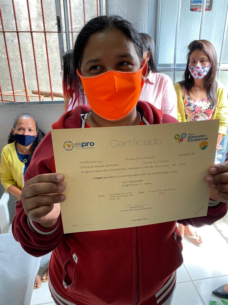 A oficina foi realizada no Jardim Paraná – região da Brasilândia (extremo norte da cidade), em parceria com o Instituto Caminho da Paz. Ao todo, 17 participantes foram iniciados na arte de corte e costura e foram criados 60 ecobags e 60 saquinhos. As peças confeccionadas formarão uma embalagem muito especial para a entrega do prêmio Espro Melhores Escolhas, aos parceiros vencedores da edição 2020. Também houve sorteio de uma máquina de costura doméstica entre os participantes – Tatiane Rodrigues Silva foi a contemplada.